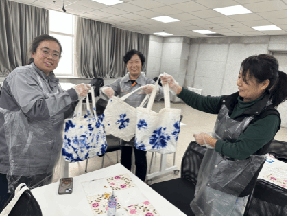 创作环节中,女教职工们兴致高涨、潜心创作,充分发挥创意,通过折叠、缠绕、捆绑等方式进行扎结、染色,操作规范有序。指导老师全程巡回答疑,及时纠正操作偏差,助力大家完成作品。现场氛围温馨融洽,教职工们相互交流技巧、分享思路,在实践中感受传统技艺的独特魅力。