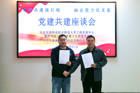 座谈结束后,数控与金工教研室教工党支部与天津博盛睿创科技有限公司党支部共同签署了《党组织共建协议书》,标志着双方将在组织共建、资源共享、人才共育等方面建立长期稳定的合作关系,推动党建与业务双融双促。