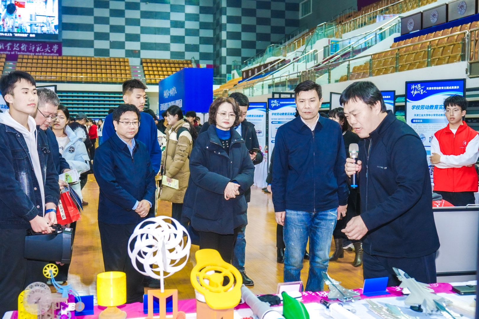 活动现场,实践基地负责人、数控与金工教研室教工党支部书记战忠秋向莅临展位的天津市总工会副主席李贤同志、天津市教委体美劳处王洪福处长、校领导蔡玉俊及校党委宣传部部长任雪浩等领导作了详细介绍。系统阐述了中心以“重技强能,致学致用”为核心的教学理念,以及在此理念下构建的独具特色的“三层次、五阶段”工程实训教学体系。中心创造性探索并实践了基于EPIP(工程实践创新项目)模式的劳动教育实践课程体系,确保学生在“做中学、学中做”,实现知识、能力与素养的同步提升。